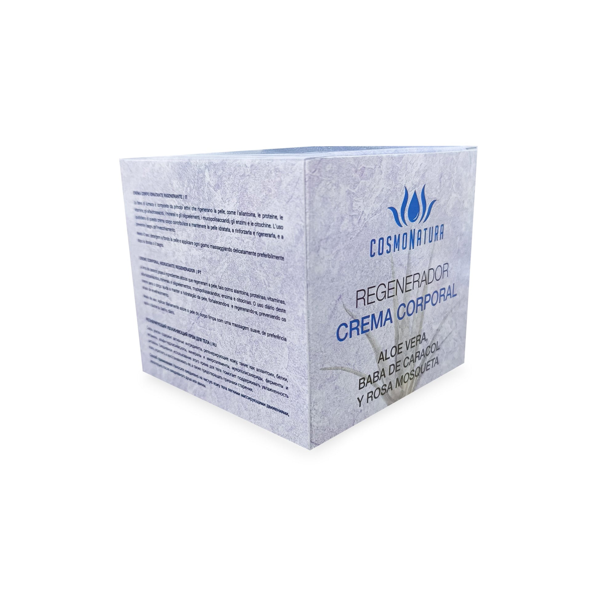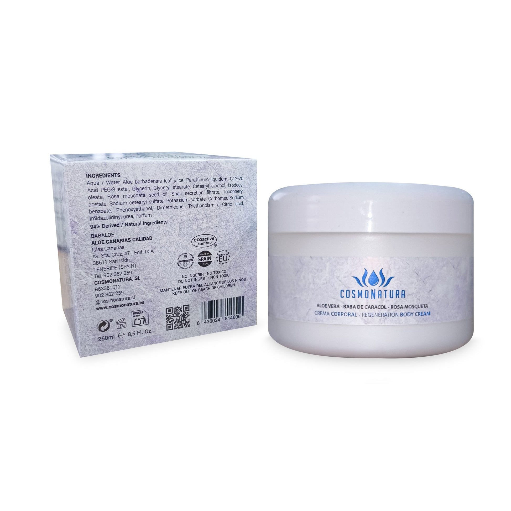 Regenerierende Körpercreme mit Aloe Vera, Schneckenschleim und Hagebutte, für die tägliche Anwendung geeignet. Hilft, die Haut mit Feuchtigkeit zu versorgen, stärkt und regeneriert sie und beugt Anzeichen vorzeitiger Hautalterung vor.